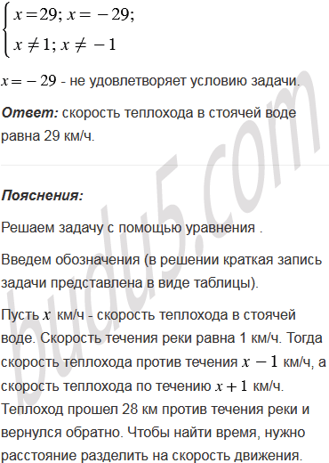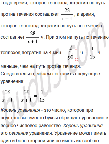 Теплоход прошел 28 км против течения реки и вернулся обратно, потратив на обратный путь на 4 мин меньше. Найдите скорость теплохода в стоячей воде, если скорость течения реки равна 1 км/ч.