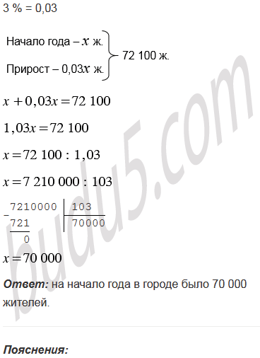 На конец года численность населения города составляла 72 100 жителей. Определите количество жителей в этом городе на начало года, если прирост населения за это время составил 3%.
