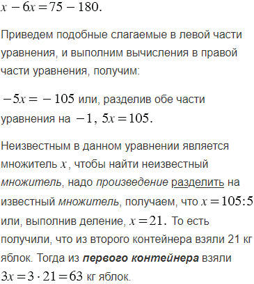 В одном контейнере было 90 кг яблок, а в другом - 75 кг. После того как из первого контейнера взяли в три раза больше яблок, чем из второго в первом осталось в 2 раза меньше яблок, чем во втором. Сколько килограммов яблок взяли из первого контейнера?