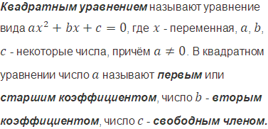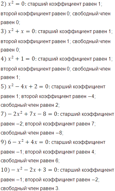 Укажите среди данных уравнений квадратные и назовите, чему равны старший коэффициент, второй коэффициент и свободный член каждого из них: