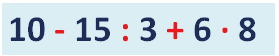 10 - 15 : 3 + 6 • 8 = 10 - 5 + 6 • 8 = 10 - 5 + 48 = 5 + 48 = 53